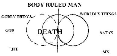 So, the next illustration of man shows spiritual death, stopping the pathway to God and making it hard for a man to communicate with the Spiritual God. His soul was now overwhelmed with physical knowledge from his body and five senses. He was now incomplete and living with an unbalanced perspective of the spiritual world and the physical world. He had to work by the sweat of his brow. The ground was cursed and would not freely yield fruit to him. And one day, his body would return to the ground where he came from, Genesis 3:17-19.